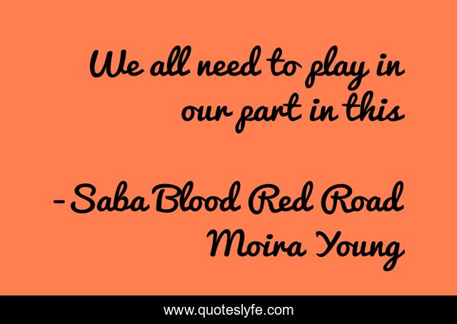 This page presents the quote "We all need to play in our part in this". Author of this quote is Saba Blood Red Road Moira Young. This quote is about trilogy, saba, blood-red-road, blood, demalo,.