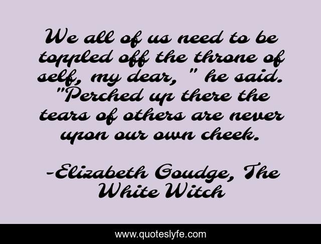 This page presents the quote "We all of us need to be toppled off the throne of self, my dear, " he said. "Perched up there the tears of others are never upon our own cheek.". Author of this quote is Elizabeth Goudge, The White Witch. This quote is about compassion, selfishness, pride, empathy,.