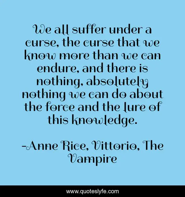 This page presents the quote "We all suffer under a curse, the curse that we know more than we can endure, and there is nothing, absolutely nothing we can do about the force and the lure of this knowledge.". Author of this quote is Anne Rice, Vittorio, The Vampire. .