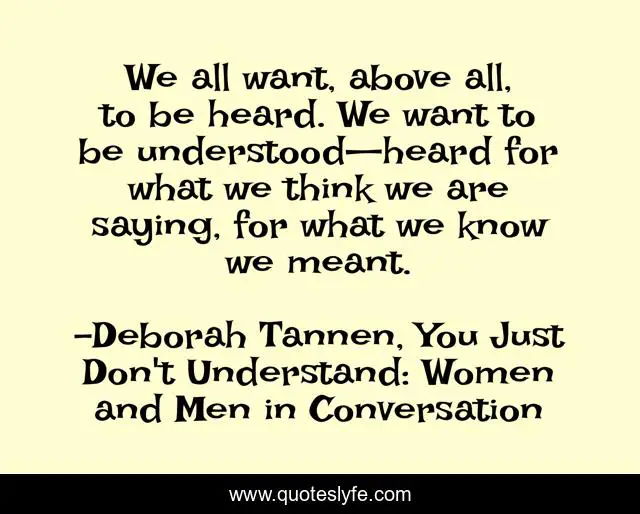 This page presents the quote "We all want, above all, to be heard. We want to be understood—heard for what we think we are saying, for what we know we meant.". Author of this quote is Deborah Tannen, You Just Don't Understand: Women and Men in Conversation. This quote is about communication, understanding,.