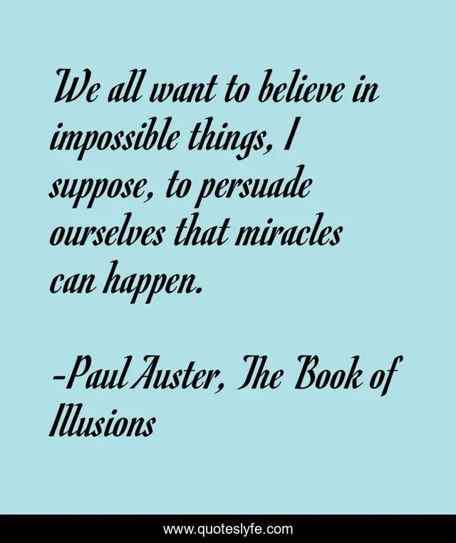 "Paul Auster, The Book of Illusions Quotes." Quoteslyfe.com, 2025. Fri. 05 Dec. 2025. <https://www.quoteslyfe.com/quote/We-all-want-to-believe-in-impossible-160097>.