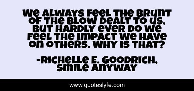 This page presents the quote "We always feel the brunt of the blow dealt to us, but hardly ever do we feel the impact we have on others. Why is that?". Author of this quote is Richelle E. Goodrich, Smile Anyway. This quote is about blow, curiosities, impact, irony, effect, brunt, richelle, irony-of-life, richelle-goodrich,.