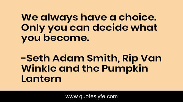 This page presents the quote "We always have a choice. Only you can decide what you become.". Author of this quote is Seth Adam Smith, Rip Van Winkle and the Pumpkin Lantern. This quote is about power-to-become, becoming, freedom-to-choose, always-choice, choice,.