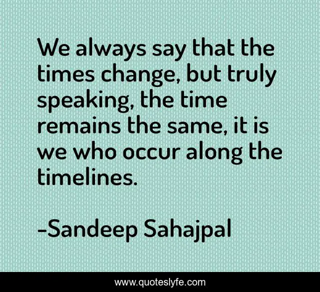 This page presents the quote "We always say that the times change, but truly speaking, the time remains the same, it is we who occur along the timelines.". Author of this quote is Sandeep Sahajpal. .