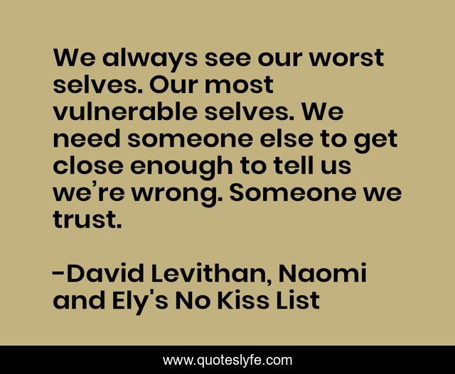 This page presents the quote "We always see our worst selves. Our most vulnerable selves. We need someone else to get close enough to tell us we’re wrong. Someone we trust.". Author of this quote is David Levithan, Naomi and Ely's No Kiss List. This quote is about friendship, trust, love, reflection, affection,.