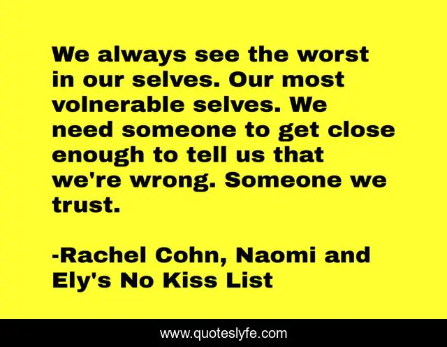 This page presents the quote "We always see the worst in our selves. Our most volnerable selves. We need someone to get close enough to tell us that we're wrong. Someone we trust.". Author of this quote is Rachel Cohn, Naomi and Ely's No Kiss List. This quote is about self, friends,.