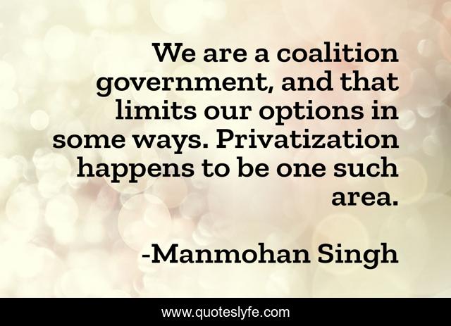 This page presents the quote "We are a coalition government, and that limits our options in some ways. Privatization happens to be one such area.". Author of this quote is Manmohan Singh. This quote is about options, limits,.