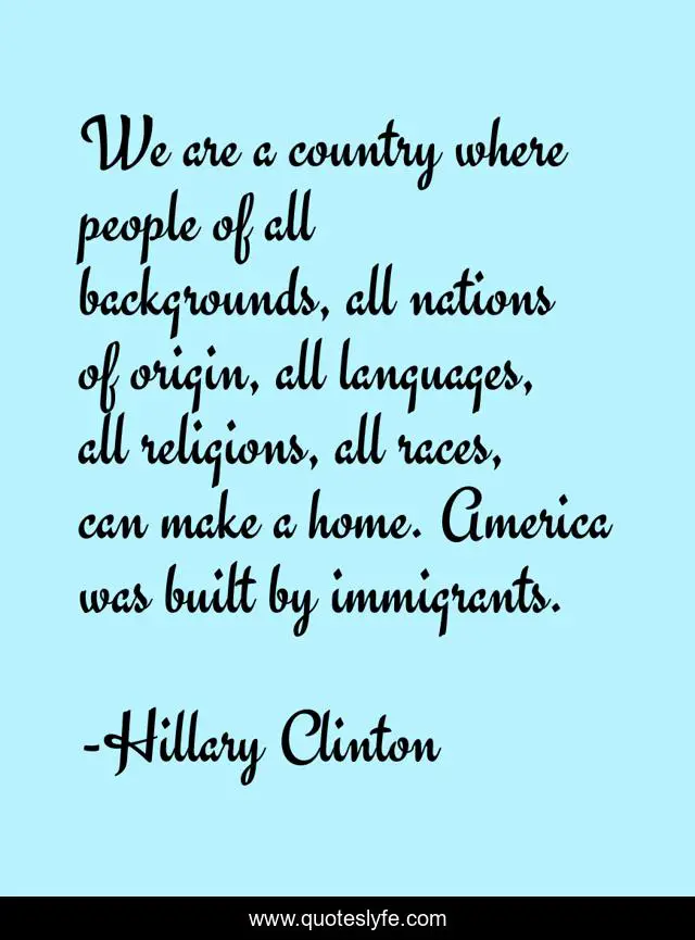 This page presents the quote "We are a country where people of all backgrounds, all nations of origin, all languages, all religions, all races, can make a home. America was built by immigrants.". Author of this quote is Hillary Clinton. This quote is about immigrants, america, people,.