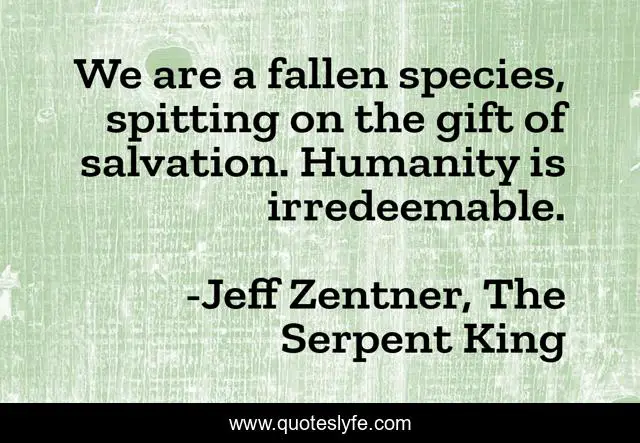 This page presents the quote "We are a fallen species, spitting on the gift of salvation. Humanity is irredeemable.". Author of this quote is Jeff Zentner, The Serpent King. .