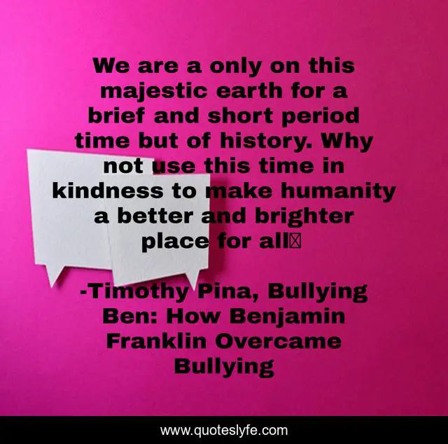 This page presents the quote "We are a only on this majestic earth for a brief and short period time but of history. Why not use this time in kindness to make humanity a better and brighter place for all❤". Author of this quote is Timothy Pina, Bullying Ben: How Benjamin Franklin Overcame Bullying. This quote is about legend-of-the-peace-panda, peace, humanity,.