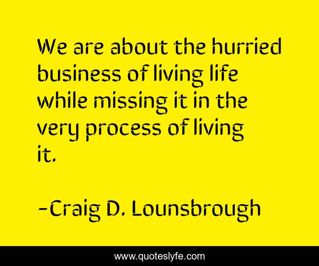 This page presents the quote "We are about the hurried business of living life while missing it in the very process of living it.". Author of this quote is Craig D. Lounsbrough. .