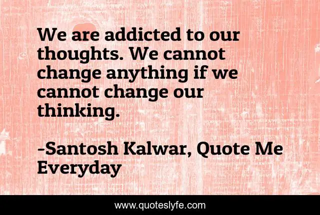 This page presents the quote "We are addicted to our thoughts. We cannot change anything if we cannot change our thinking.". Author of this quote is Santosh Kalwar, Quote Me Everyday. This quote is about thinking, addiction, philosophy, life-lessons, thoughts,.