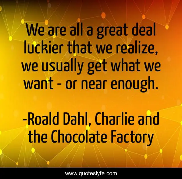 This page presents the quote "We are all a great deal luckier that we realize, we usually get what we want - or near enough.". Author of this quote is Roald Dahl, Charlie and the Chocolate Factory. This quote is about contentment, happiness, luck,.
