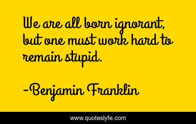 This page presents the quote "We are all born ignorant, but one must work hard to remain stupid.". Author of this quote is Benjamin Franklin. This quote is about stupid, knowledge, work hard,.