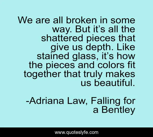 This page presents the quote "We are all broken in some way. But it’s all the shattered pieces that give us depth. Like stained glass, it’s how the pieces and colors fit together that truly makes us beautiful.". Author of this quote is Adriana Law, Falling for a Bentley. .