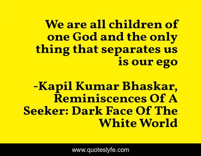 This page presents the quote "We are all children of one God and the only thing that separates us is our ego". Author of this quote is Kapil Kumar Bhaskar, Reminiscences Of A Seeker: Dark Face Of The White World. This quote is about god, spiritual, book, spiritual-growth, spirituality,.