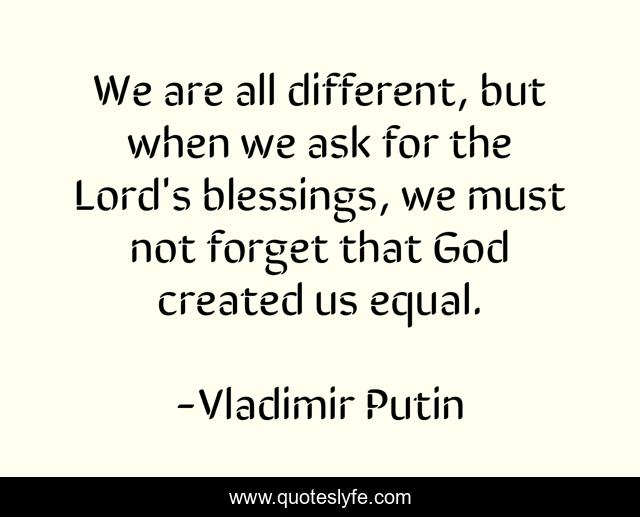 This page presents the quote "We are all different, but when we ask for the Lord's blessings, we must not forget that God created us equal.". Author of this quote is Vladimir Putin. This quote is about blessings, forget, equal,.