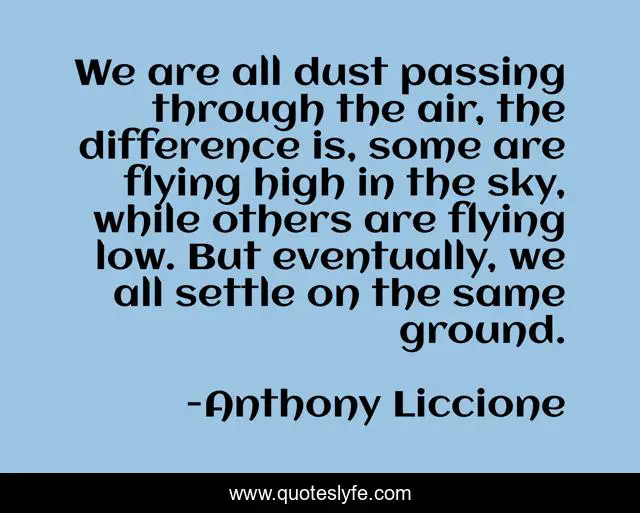This page presents the quote "We are all dust passing through the air, the difference is, some are flying high in the sky, while others are flying low. But eventually, we all settle on the same ground.". Author of this quote is Anthony Liccione. This quote is about even, poor, life, death, level, dirt, low, same-in-measure, creation,.