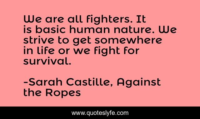 This page presents the quote "We are all fighters. It is basic human nature. We strive to get somewhere in life or we fight for survival.". Author of this quote is Sarah Castille, Against the Ropes. This quote is about enthusiasm, against-the-ropes, fighter, inspirational, sarah-castille,.