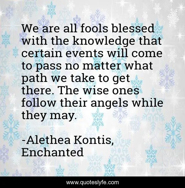 This page presents the quote "We are all fools blessed with the knowledge that certain events will come to pass no matter what path we take to get there. The wise ones follow their angels while they may.". Author of this quote is Alethea Kontis, Enchanted. This quote is about enchanted, fools, angels, wednesday,.