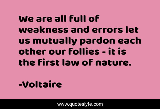This page presents the quote "We are all full of weakness and errors let us mutually pardon each other our follies - it is the first law of nature.". Author of this quote is Voltaire. This quote is about weakness, law, first,.
