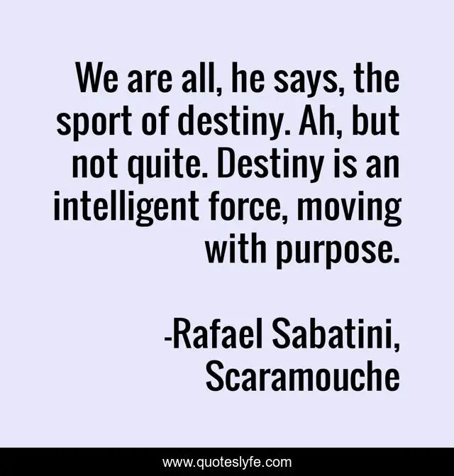 This page presents the quote "We are all, he says, the sport of destiny. Ah, but not quite. Destiny is an intelligent force, moving with purpose.". Author of this quote is Rafael Sabatini, Scaramouche. This quote is about fate, destiny, scaramouche,.