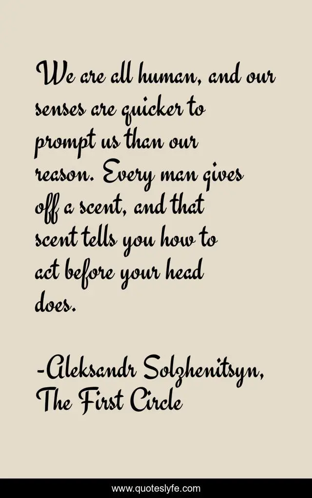 This page presents the quote "We are all human, and our senses are quicker to prompt us than our reason. Every man gives off a scent, and that scent tells you how to act before your head does.". Author of this quote is Aleksandr Solzhenitsyn, The First Circle. This quote is about thought, reason, scent, humanity, sense,.