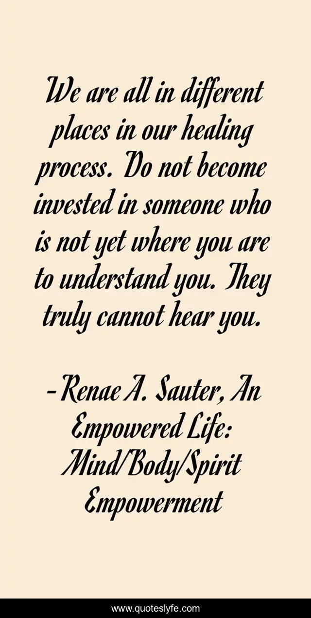 This page presents the quote "We are all in different places in our healing process. Do not become invested in someone who is not yet where you are to understand you. They truly cannot hear you.". Author of this quote is Renae A. Sauter, An Empowered Life: Mind/Body/Spirit Empowerment. This quote is about psychology, self-development, wisdom, mental-health, mind-body-spirit, inspirational, self-help, enthusiasm,.