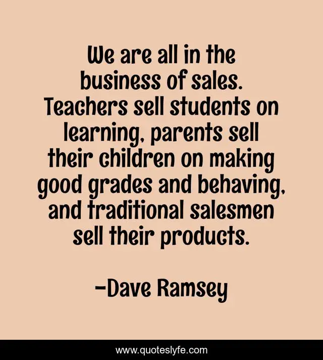 This page presents the quote "We are all in the business of sales. Teachers sell students on learning, parents sell their children on making good grades and behaving, and traditional salesmen sell their products.". Author of this quote is Dave Ramsey. This quote is about good, children, learning,.