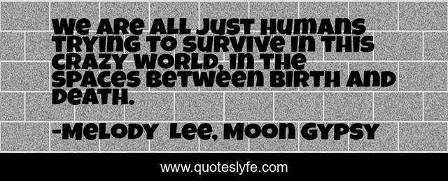 This page presents the quote "We are all just humans trying to survive in this crazy world, in the spaces between birth and death.". Author of this quote is Melody Lee, Moon Gypsy. This quote is about survive, death, humans, poetry, birth,.