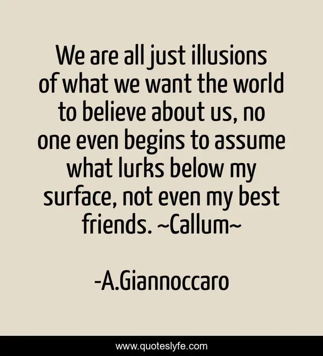 This page presents the quote "We are all just illusions of what we want the world to believe about us, no one even begins to assume what lurks below my surface, not even my best friends. ~Callum~". Author of this quote is A.Giannoccaro. This quote is about book-boyfriend, broken-souls, delusional-love, madness, dark-reads,.