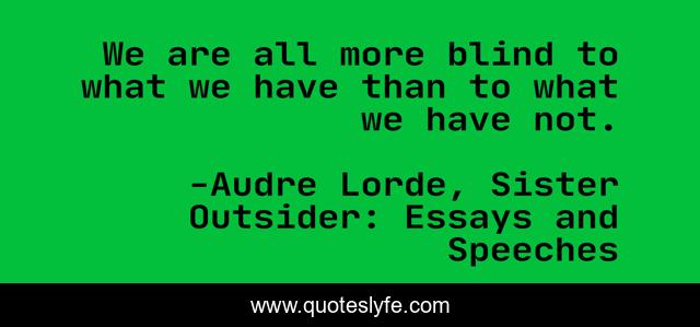 This page presents the quote "We are all more blind to what we have than to what we have not.". Author of this quote is Audre Lorde, Sister Outsider: Essays and Speeches. This quote is about gratitude, blindness,.