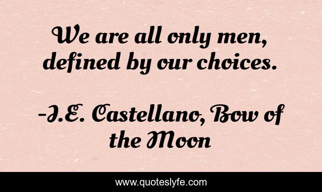 This page presents the quote "We are all only men, defined by our choices.". Author of this quote is I.E. Castellano, Bow of the Moon. This quote is about reflective, philosophical, thought-provoking, inspirational, enthusiasm,.