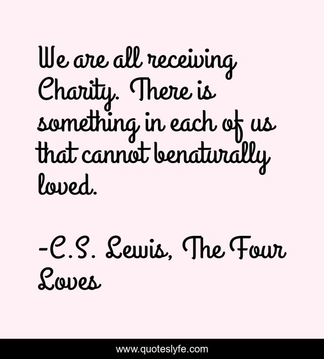 This page presents the quote "We are all receiving Charity. There is something in each of us that cannot benaturally loved.". Author of this quote is C.S. Lewis, The Four Loves. This quote is about love, charity, natural, affection, naturally,.