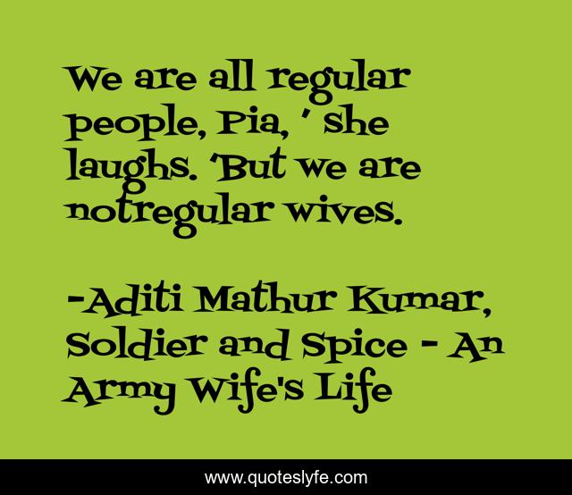 This page presents the quote "We are all regular people, Pia, ’ she laughs. ‘But we are notregular wives.". Author of this quote is Aditi Mathur Kumar, Soldier and Spice - An Army Wife's Life. This quote is about funny, army-wife, army, proud, wife, military, comedy,.