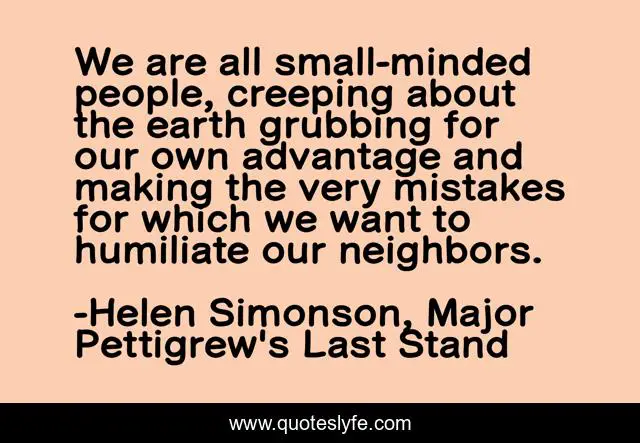 This page presents the quote "We are all small-minded people, creeping about the earth grubbing for our own advantage and making the very mistakes for which we want to humiliate our neighbors.". Author of this quote is Helen Simonson, Major Pettigrew's Last Stand. This quote is about living, kindness, ignorance, knowledge, wisdom,.