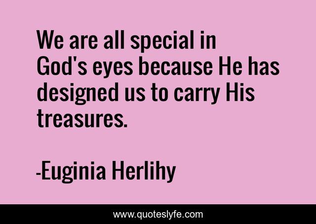 This page presents the quote "We are all special in God's eyes because He has designed us to carry His treasures.". Author of this quote is Euginia Herlihy. .