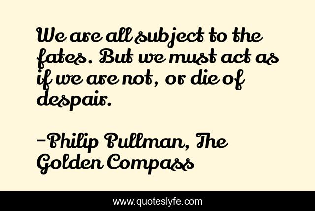 This page presents the quote "We are all subject to the fates. But we must act as if we are not, or die of despair.". Author of this quote is Philip Pullman, The Golden Compass. This quote is about destiny, fate,.