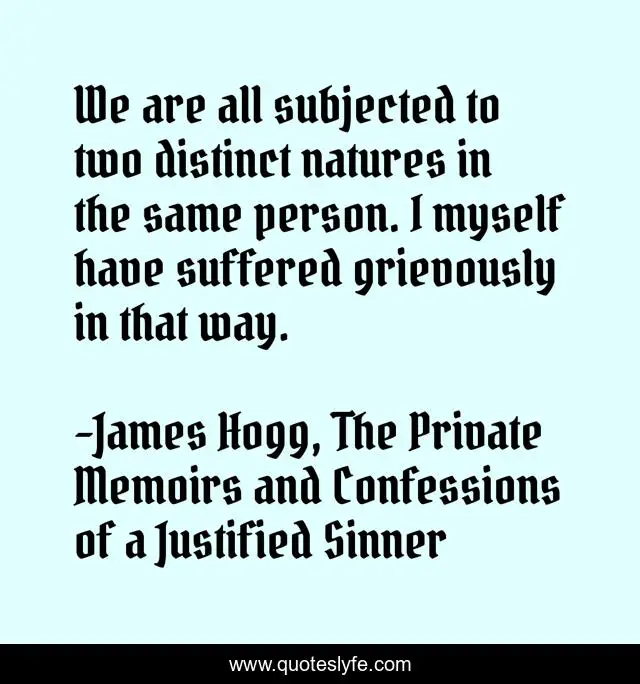 This page presents the quote "We are all subjected to two distinct natures in the same person. I myself have suffered grievously in that way.". Author of this quote is James Hogg, The Private Memoirs and Confessions of a Justified Sinner. .