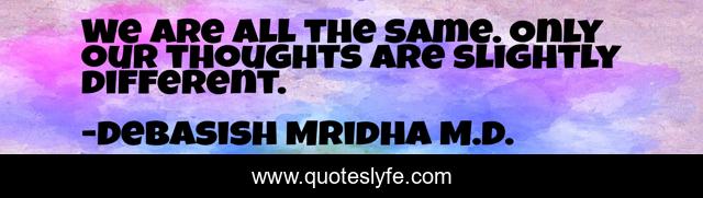 This page presents the quote "We are all the same. Only our thoughts are slightly different.". Author of this quote is Debasish Mridha M.D.. This quote is about equality, philosophy, debasish-mridha, quotes, inspirational, enthusiasm, debasish-mridha-m-d, thoughts, we-are-all-the-same,.