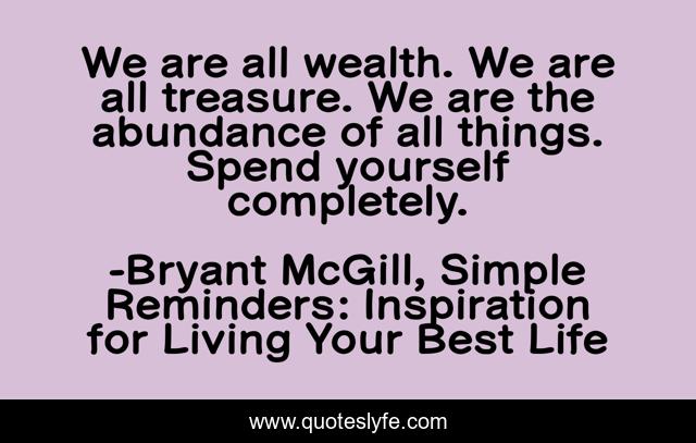 This page presents the quote "We are all wealth. We are all treasure. We are the abundance of all things. Spend yourself completely.". Author of this quote is Bryant McGill, Simple Reminders: Inspiration for Living Your Best Life. This quote is about abundance, things, treasures, wealth,.