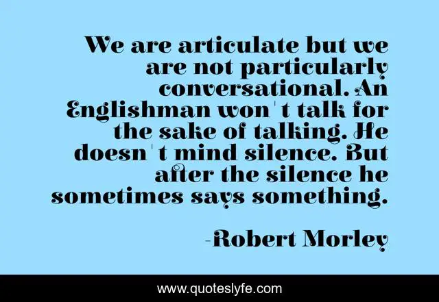 This page presents the quote "We are articulate but we are not particularly conversational. An Englishman won't talk for the sake of talking. He doesn't mind silence. But after the silence he sometimes says something.". Author of this quote is Robert Morley. This quote is about , england, k, u,.