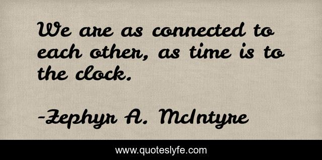 This page presents the quote "We are as connected to each other, as time is to the clock.". Author of this quote is Zephyr A. McIntyre. .