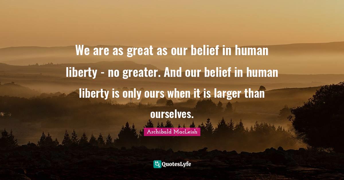 This page presents the quote "We are as great as our belief in human liberty - no greater. And our belief in human liberty is only ours when it is larger than ourselves.". Author of this quote is Archibald MacLeish. This quote is about liberty, belief, greater, atheism,.