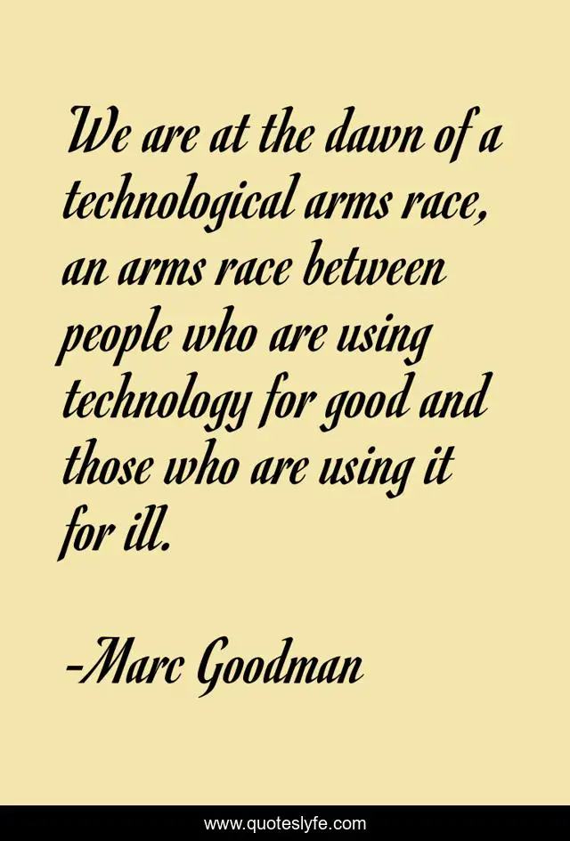 This page presents the quote "We are at the dawn of a technological arms race, an arms race between people who are using technology for good and those who are using it for ill.". Author of this quote is Marc Goodman. This quote is about science, technology, future, ted, crime,.