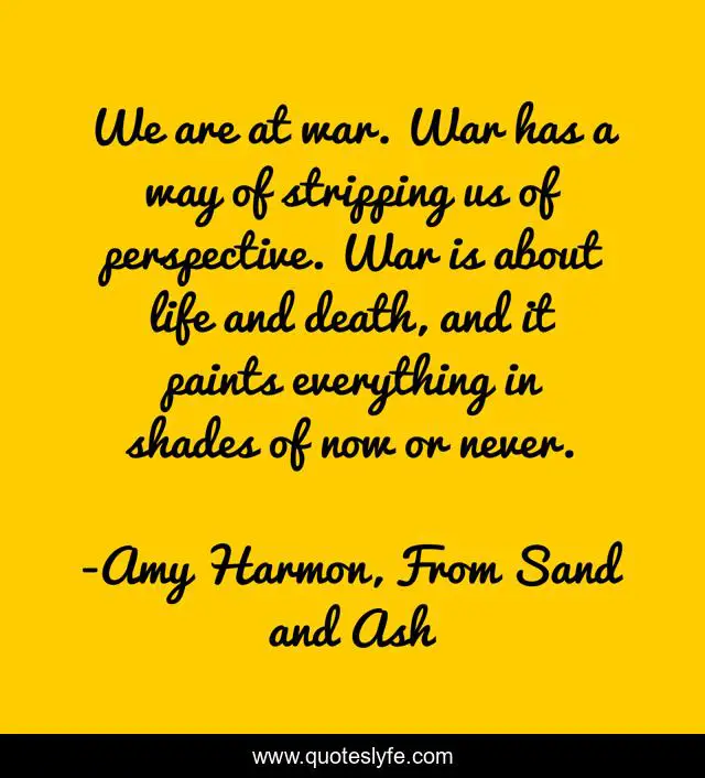 This page presents the quote "We are at war. War has a way of stripping us of perspective. War is about life and death, and it paints everything in shades of now or never.". Author of this quote is Amy Harmon, From Sand and Ash. .