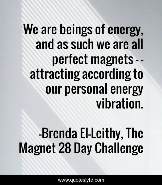 This page presents the quote "We are beings of energy, and as such we are all perfect magnets - – attracting according to our personal energy vibration.". Author of this quote is Brenda El-Leithy, The Magnet 28 Day Challenge. This quote is about brenda-el-leithy, 28-day-challenge, self-help-book, self-help,.