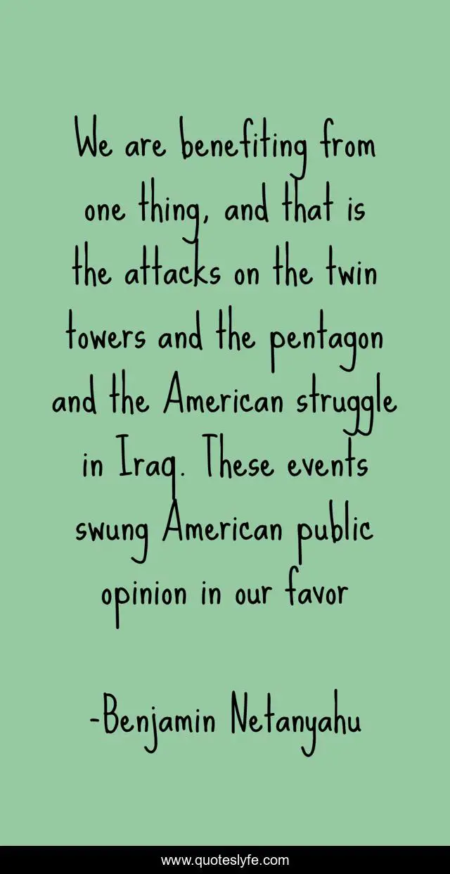 This page presents the quote "We are benefiting from one thing, and that is the attacks on the twin towers and the pentagon and the American struggle in Iraq. These events swung American public opinion in our favor". Author of this quote is Benjamin Netanyahu. This quote is about zionism, war-on-terror, iraq, israel, terrorism,.