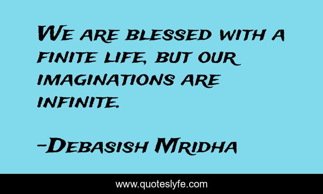 This page presents the quote "We are blessed with a finite life, but our imaginations are infinite.". Author of this quote is Debasish Mridha. This quote is about miraboli, oscar-wilde, philosophy, debasish-mridha, imaginations, imagination, quotes, debasish-mridha-md, inspirational,.