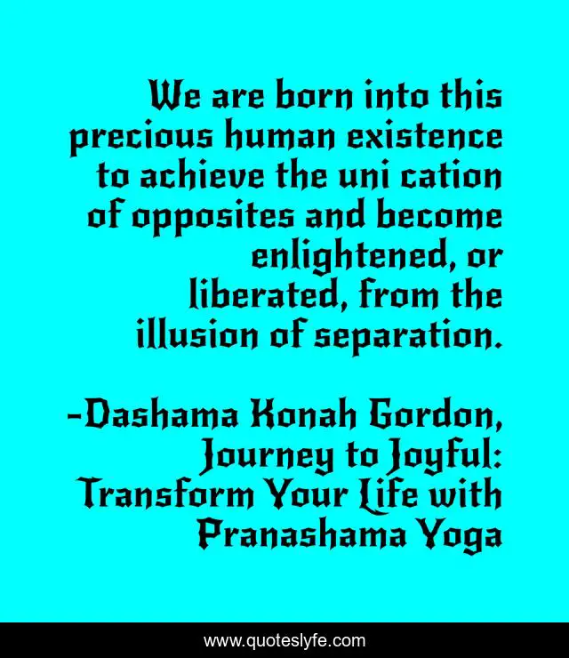 This page presents the quote "We are born into this precious human existence to achieve the uni cation of opposites and become enlightened, or liberated, from the illusion of separation.". Author of this quote is Dashama Konah Gordon, Journey to Joyful: Transform Your Life with Pranashama Yoga. This quote is about self-love, love, healing, inspirational, enthusiasm, happiness, yoga, affection, inspiration,.